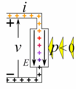 In practice, assigning the voltage and current variables in a circuit is not necessary to comply with the PSC. Components in which the variables have a "backward" relationship, in which the current variable enters the negative terminal, can still be made to comply with the PSC by changing the sign of the constitutive relations (1) and (2) used with them.[5] A current entering the negative terminal is equivalent to a negative current entering the positive terminal, so in such a component[5][7]