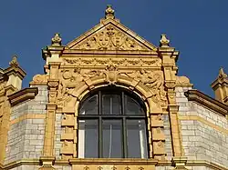 The building has three floors. There is a continuous plinth running along the façade at ground level. Cornices run continuously across the façade at the top of the ground and first floors, the cornice at the top of the second floor is interrupted by triangular and curved window pediments. The upper two floors are decorated with pilasters and finials that protrude from the façade. The windows have mullions and transoms and the top-most panes have semi-circular heads. The second floor is particularly elaborate with swags, finials and Gibbs surrounds to the windows. Lettering on ceramic panels across the front gives the original name of the "Passmore Edwards Library and Science, Art and Technical School". The main entrance has a significant pedimented doorcase decorated at the second storey with figures representing Art and Learning. The double doors are topped with a semi-circular fanlight within a Gibbs surround. The fourth bay from the north end of the Bank Street elevation has a secondary entrance with a doorcase and triangular pediment. The interior has a mosaic floor and retains some oak panelled doors. The staircase is Jacobean in style with square balusters and newels with pendants.[1]