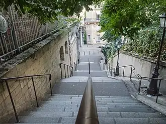 The metro and the stairways bisect the Square Alboni, a chic residential subdivision on the hillside whose properties were assembled and developed between 1894 and 1930. Named, like the Rue, after a famous opera contralto of the day, the Square has several buildings designed by Louis Dauvergne, with the others intended to harmonize. The buildings around the Square and the (private) park in its center, are not much visible from the platform, but can be seen from the stairways and the streets. Dauvergne also designed Les Grands Hotels du Trocadéro, the now-iconic turreted buildings on both sides of the Rue Marietta-Alboni above and below the hillside. They were built as hotels for visitors to the 1900 International Exposition and afterwards rented as apartments.[1][2][3][4]