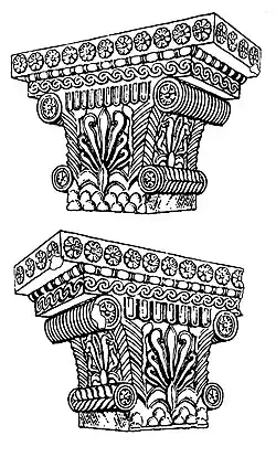 The capital is decorated with Classical Greek designs, such as the row of repeating rosettes, the ovolo, the bead and reel moulding, the wave-like scrolls as well as the central flame palmette and the volutes with central rosettes. It has been described as quasi-Ionic,[12] displaying definite Near Eastern influence,[13] or simply Greek in design and origin.[14]