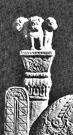 The Sarnath capital is a pillar capital discovered in the archaeological excavations at the ancient Buddhist site of Sarnath.[35] The pillar displays Ionic volutes and palmettes.[36][37] It has been variously dated from the 3rd century BCE during the Mauryan Empire period,[38][35] to the 1st century BCE, during the Sunga Empire period.[36] One of the faces shows a galopping horse carrying a rider, while the other face shows an elephant and its mahaut.[36]
