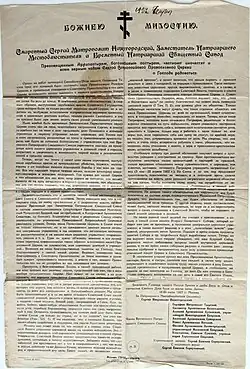 Starting in 1927, he pursued a policy of unconditional loyalty to the Soviet government,[1] which led to significant criticism of him and the separation of some lay people and clerics.
