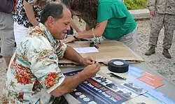 ![]() Ching autographing copies of a newly released poster featuring Marine Corps Base Hawaii efforts to protect Hawaiian monk seals during an unveiling ceremony, May 23, 2012 | |