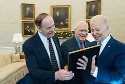 The September 11 attacks on the World Trade Center shifted American foreign policy focus to terrorism. In December 2006, during an appearance at the law school of Georgetown University, Leahy said that after the September 11 attacks, "the White House accelerated its power plays at the expense of the other branches of government, all in the name of fighting terrorism." He added that the administration had declined to answer "the legitimate oversight questions of the public's duly elected representatives", as well as broken the law by wiretapping Americans without warrants.[75] On September 13, 2002, Leahy said in a radio interview that an investigation should be launched into whether the West Nile virus was a biological terrorism effort.[76] During a July 1, 2007, interview, Leahy said he was not against lawful eavesdropping and recommended a revision to the Federal Intelligence Surveillance Act, so potential terrorists could be investigated without question.[77] Leahy added that the White House had been subpoenaed, so George W. Bush administration officials could explain "the legal justification they tried to follow when, for years, they wiretapped ordinary Americans and everyone else put out a warrant."[77] Leahy was one of two senators targeted in the 2001 anthrax attacks. The anthrax letter meant for him was intercepted before it reached his office. In 2004, Leahy was awarded the Electronic Privacy Information Center's Champion of Freedom Award, for efforts in information privacy and open government. He is regarded as one of the leading privacy advocates in Congress.[78] In 2000, Leahy cosigned a letter sent to Appropriations Committee conference members, requesting a delay in implementing Section 304 in H.R. 4392, the Intelligence Authorization Act for Fiscal Year 2001,[79] until it could be fully considered by the Senate Committee on the Judiciary. The amendment would introduce new felony crime laws, concerning the unauthorized disclosure of information. Leahy and his colleagues indicated this would be in conflict with existing First Amendment rights and Whistleblower Protection Acts.[80][81] On June 22, 2004, Leahy and Vice President Dick Cheney participated in the U.S. Senate class photo. After the vote, Cheney was talking to only Republicans. When Leahy asked him to come over and talk to the Democrats, Cheney upbraided Leahy for the Senator's recent excoriations of Halliburton's activities in Iraq. At the end of the exchange, Cheney told Leahy, "Go fuck yourself."[82][83] Leahy joked about the incident in 2007, when he escorted Bernie Sanders, Vermont's newly elected senator, to the well of the Senate where he was sworn in by Cheney: "When it comes to the vice president, it's always better to be sworn in than to be sworn at."[84]