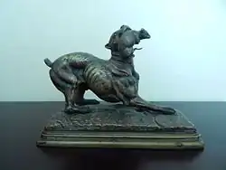 As early as December 1869 his sculptures had begun to be imported to the United States by the Philadelphia jewelry firm of J. E. Caldwell & Co. who had a store at 902 Chesnut Street. The store also advertised works by Jean-Louis Grégoire, Carrier, Moigniez, Mêne, and others.[7] Delabrièrre portrayed realism in nearly all his sculptures. His circa 1870 bronze of a dog defecating took realism to an extreme level and was unusual if not outright strange. The subject matter was likely detrimental to the sales of the sculpture;[6] however, it did possess certain qualities as a conversation piece. Bronzes by Delabrièrre and fellow animalier and countryman Jules Moigniez were popular in Britain and the United States in the late 19th century.