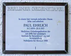 The German Paul Ehrlich Institute, the successor to the Steglitz Institute for Serum Research and Serum Testing and the Frankfurt Royal Institute for Experimental Therapy, was named in 1947 after Ehrlich, its first director.[21]