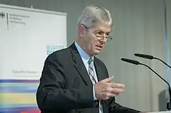 Krüger said there was a "crisis not seen since 1945" that Germany was falling behind the United States and Japan in research and development and that funding for this was being rapidly cut.[18][19] To combat this, he introduced funding for genetic research and to artificially produce drugs, like those to prevent hemophilia.[20] He also focused on nuclear power, saying that there could be the responsible and safe usage of plants, as exemplified by the Niederaichbach Nuclear Power Plant where it was dismantled and no longer as radioactive.[21] Another important thing in his term was the telecommunications infrastructure, where he pushed for the end of a monopoly,[22] and said that with this telecommunications will contribute to a large percentage of the gross national product.[23]