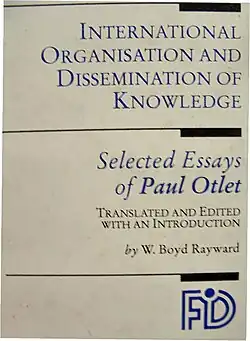 7. ^ Otlet, Paul (1990). Rayward, Warden Boyd (ed.). International organisation and dissemination of knowledge. Publication / Fédération Internationale de Documentation. Amsterdam: Elsevier. ISBN 978-0-444-88678-1.