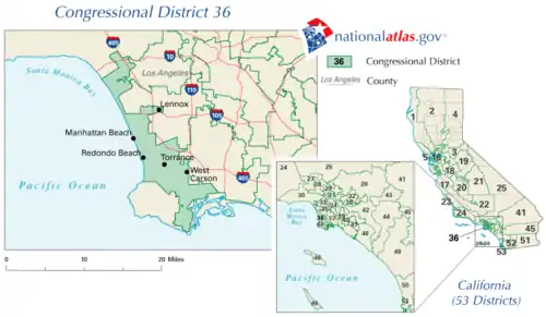 California's 36th congressional district is a U.S. congressional district in California. The 36th district is located primarily in the South Bay and Westside regions of Los Angeles. It takes in the cities of Beverly Hills, Santa Monica, the west side of Culver City, Hermosa Beach, Rancho Palos Verdes, Redondo Beach, Palos Verdes Estates, Rolling Hills Estates, El Segundo, Lomita, Manhattan Beach, and the west side of Torrance, as well as the Los Angeles neighborhoods of Venice, Playa del Rey, Playa Vista, Palms, Cheviot Hills, Westwood Village, West Los Angeles, Mar Vista, Westchester, Marina Peninsula, and west side Harbor City.