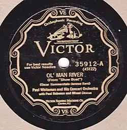 In 2006 the Paul Whiteman Orchestra's 1928 recording of Ol' Man River with Paul Robeson on vocals was inducted into the Grammy Hall of Fame. The song was recorded on March 1, 1928, in New York and released as Victor 35912-A.[64]