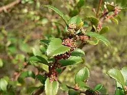 Paxistima myrsinites is a low prostrate or spreading evergreen shrub growing to 1 metre (3 ft 3 in) in maximum height. The stems have many four-angled branches lined with oppositely arranged oval leaves roughly 1–3 centimetres (0.39–1.18 in) long. The leaves are thick, leathery, toothed, and pointed or round-tipped. They are light green when new and shiny dark green when mature. Blossoming occurs from June to August.[2] The inflorescences occur in the leaf axils, where there appears a single flower or cluster of up to three. The small flat flower has four dark red oval petals about a 1 millimetre (0.039 in) long. The fruit is an oblong capsule under 1 centimetre (0.39 in) long containing usually one seed in each of its two valves. The seed is dark and shiny and partly covered in a white aril. The shrub reproduces via seed, but it can also be propagated with cuttings.[3]
