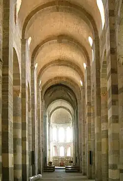 Archaeological excavations have led to new insights into the first church, which was built in the 10th century. In 960 it was expanded following the model of the Church of Cluny and the entrance hall was extended. A second building phase began in the middle of the 11th century, which brought the church to approximately its current appearance. A new nave was added around 1070-80.[3]