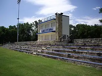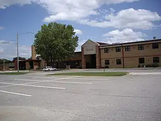 In 1943, German and Italian prisoners of World War II were brought to Kansas and other midwest states as a means of solving the labor shortage caused by American men serving in the war effort. Large prisoner-of-war camps camps were established in Kansas at Camp Concordia, Camp Funston (at Fort Riley), and Camp Phillips (at Salina under Fort Riley). Fort Riley established 12 smaller branch camps, including Peabody and El Dorado.[30][31] Up to 150 prisoners were quartered at the Peabody branch camp.[10] Farmers were to have first priority over other industries in requesting prisoner labor. County agents were responsible for processing the application of local residents seeking the use of the prisoners who were to be available only as group laborers. No fewer than four prisoners could be assigned to a farm, and a guard accompanied each group, but later it was common for no guards to accompany the prisoners. The prisoners were not allowed to operate any powered farm equipment. The farmer collected the workers at the camp and returned them at the end of each day. The Peabody branch camp #101 was located in the Eyestone building, now occupied by Heckendorn Equipment Company, and located at 122 West 2nd Street.[10] The prisoner yard was located in the north-east corner of the property and still exists as a storage area. The camp was closed in December 1945, after Germany surrendered.[10]