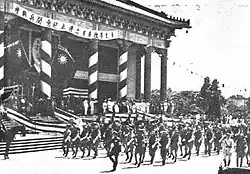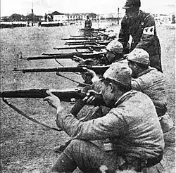 During its existence, the Reorganized National Government of the Republic of China fielded a force that was estimated by Western sources to have been between 300,000 and 500,000 strong.[3] Wang Jingwei initially planned to raise a force of twelve divisions under his personal command,[4] although most Nanjing Government troops were only under his nominal control throughout the war. All military matters were theoretically managed by the Central Military Commission, but in reality the body was largely symbolic and had little authority. The Nanjing Army commanders were able to operate without much interference from Wang's government and in many cases were former warlords or officers of Chiang Kai-shek's Nationalist Army.[3] Wang initially recruited his troops from former Nationalist soldiers and the collaborationist troops that had previously served the Provisional and Reformed Governments, which were both united under Wang's command. In the "Japan–China Military Affairs Agreement" signed by Japan and the Reorganized National Government, the Japanese agreed to train and equip an unspecified number of divisions for the Nanjing Army. They were provided with mostly captured Nationalist equipment along with small amounts of Japanese weapons.[4]