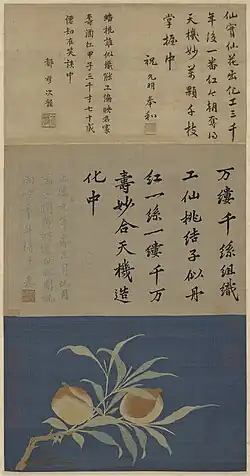 In Chinese mythology, Peaches of Immortality[1] (Chinese: 仙桃; pinyin: xiāntáo; Cantonese Yale: sīn tòuh or Chinese: 蟠桃; pinyin: pántáo; Cantonese Yale: pùhn tòuh) are consumed by the immortals due to their mystic virtue of conferring longevity on all who eat them. Peaches symbolizing immortality (or the wish for a long and healthy life) are a common symbol in Chinese art, appearing in depictions or descriptions in a number of fables, paintings, and other forms of art, often in association with thematically similar iconography, such as certain deities or immortals or other symbols of longevity, such as deer or cranes.