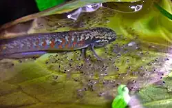 The peacock gudgeon or peacock goby (Tateurndina ocellicauda) is a tropical freshwater species of fish in the family Eleotridae that is endemic to the eastern part of Papua New Guinea.[3] It can be found in schools hovering over the substrate in rivers and ponds. This species can reach a length of 7.5 cm (3.0 in). It is currently the only known member of its genus.[4]