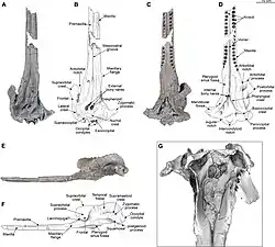 The supraorbital crests arch over the medial part of the skull and form the lateral border to the circumnarial basin, with the back of said basin being restricted by the nuchal crest. This gives the back of the skull a more rectangular appearance. The circumnarial basin is a large depression in the upper surface of the skull that surrounds the bony nares, which in Pebanista are shifted towards the left side, contributing to the asymmetry among the facial bones. This is regarded a notable feature that helps identify Pebanista as a platanistid. This asymmetry is not simply limited to the nares either. The highest point of the skull, the vertex is shifted towards the left as well, as are the premaxillae and several facial bones. Only a single orbit is preserved in the holotype, however, based on this it appears to have been proportionally shorter, which is only shared by species of Platanista and not seen in other members of the family. The ventral surface of the skull prominently displays the pterygoid bones, which obscure the vast majority of the palatines sans narrow regions exposed towards the side of the skull. The temporal fossae, which stretch across the lateral surface of the skull on either side, are noted to be longer than they are high and extend so far back that they enter the occipital region. Vice versa, the occipital shield might project slightly forward into the anterior parts of the skull, however, it is likewise possible that this condition was simply caused by the skull being distorted during preservation.[1]