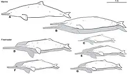 Toothed whales are known to have transitioned from marine environments into freshwater habitats multiple times throughout their evolutionary history, with four distinct groups of such "river dolphins" persisting into the Holocene (although Lipotidae have recently gone extinct while Pontoporiidae are not strictly freshwater animals). The salt-to freshwater transition of the Iniidae (South American river dolphins) is hypothesized to have occurred at some point towards the Late Miocene given the appearance of Ischyrorhynchus in rivers and deltas of Argentina during this time period, while marine forms persisted until the Pliocene. Platanistids meanwhile appear to have first ventured into freshwater during the Early to Middle Miocene, as evidenced not only by Pebanista but also based on the discovery of Platanista-like earbones recovered from La Venta (Colombia) and the Fitzcarrald Arch (Peru) that could represent close relatives.[1]