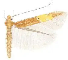 Male, female. Forewing length 3.4-4.2 mm. Head: frons shining ochreous-white with greenish reflection, vertex and neck tufts shining brown with greenish and reddish reflections, laterally and medially lined white, collar shining brown; labial palpus first segment very short, white, second segment three-quarters of the length of third, dark brown with white longitudinal lines laterally and ventrally, third segment white, lined brown laterally, extreme apex white; scape dorsally shining dark brown with a white anterior line, ventrally shining white, antenna shining dark brown with a white line from base to two-thirds, followed towards apex by one white segment, three dark brown, two white, eight dark brown and three white segments at apex. Thorax and tegulae shining brown with reddish gloss, thorax with a white median line in posterior half. Legs: shining greyish brown, femora of midleg and hindleg shining greyish ochreous, foreleg with a white line on tibia and tarsal segments one to three, segment five entirely white, tibia of midleg with white oblique basal and medial lines and a white apical ring, tarsal segment one and two with white apical rings, segment five entirely white, tibia of hindleg with a very oblique white line from base to beyond one half and a white apical ring, tarsal segment one with white basal and ochreous apical ring, segment two with an indistinct ochreous apical ring, segment five entirely whitish, spurs white dorsally, brown ventrally. Forewing shining brown with reddish gloss, five narrow white lines in the basal area, a first subcostal, close to costa, from base to one-quarter, followed by a second subcostal between the end of the first subcostal and the transverse fascia, a medial just above fold from beyond base to one-third, a short, slightly oblique subdorsal from one-quarter almost to the end of the second subcostal, a dorsal from one-eighth to one-quarter, a bright yellow transverse fascia beyond the middle with a broad prolongation towards apex and with a long and narrow apical protrusion to the cilia, bordered at the inner edge by two tubercular pale golden metallic subcostal and dorsal spots, the subcostal spot with a patch of blackish scales on the outside, the dorsal spot further from base, two tubercular pale golden metallic costal and dorsal spots at three-quarters of the transverse fascia, both spots opposite, the costal spot greyish brown edged inwardly, the dorsal spot three times as large as the costal, a white costal streak from the outer costal spot, a narrow shining white apical line in the apical cilia, cilia brown at apex, paler towards dorsum. Hindwing shining dark brownish grey, cilia brown. Underside: forewing shining dark greyish brown with an ochreous costal streak in the apical half, the white apical line indistinctly visible, hindwing shining dark greyish brown. Abdomen dorsally dark olive brown with greenish and reddish reflections, laterally with pale ochreous spots, ventrally shining dark grey, segments banded shining yellowish white posteriorly and with a broad shining yellowish white longitudinal streak, anal tuft ochreous-white, in the female dorsally olive brown with golden gloss, ventrally ochreous.[1]