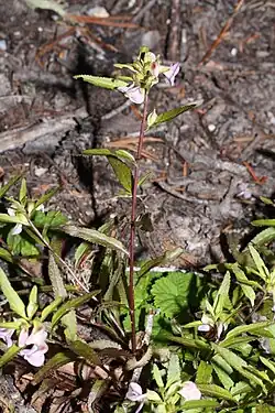 Pedicularis racemosa is a species of flowering plant in the family Orobanchaceae known by the common names sickletop lousewort and leafy lousewort. It is native to western North America, where it grows in coniferous forests. This is a perennial herb producing several stems up to 80 centimetres (31 in) tall, greenish to dark red in color. The leaves are up to 10 centimetres (4 in) long, linear in shape and lined with teeth. The inflorescence is a small raceme of flowers occupying the top of the stem. Each white to light purple or yellow flower is up to 1.6 centimetres (2โ3 in) long and is divided into a curved or coiled beak-like upper lip and a wide three-lobed lower lip. The fruit is a capsule over a centimeter in length containing smooth seeds.