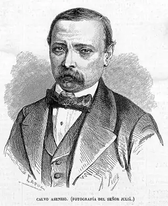 In the early days of his political career, his friendship with Sagasta which began in the turbulent month of May 1848, during the Revolutions of 1848 was of vital importance. The two were from then on good friends and partners in the Progressive Party and the two were elected in the same election as deputies to the constitutional convention of 1854. Sagasta to the province of Zamora and Asensio to Valladolid. Much later, in 1857, Sagasta was incorporated into the newspaper La Iberia, led by Calvo Asensio, its director, and later, after the death of Calvo Asensio, went to buy his shares of La Iberia from his widow and directed the paper.