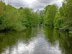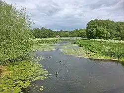 Only a short section of the original Peel's Cut, at the northern end, remains in water. The name has become extended to the stretch of water formerly known as the Fleet, which runs parallel to the main river channel before rejoining it near to Burton Library and the Meadowside Leisure Centre. This stretch is crossed by the wooden-decked Cattle Bridge footbridge, renovated in 2018. It is also crossed by Stapenhill Viaduct, erected in 1890 as an extension of the Ferry Bridge across the main channel to replace a set of stepping stones, and Andresey Bridge erected in 1884.[1][11][12][13]