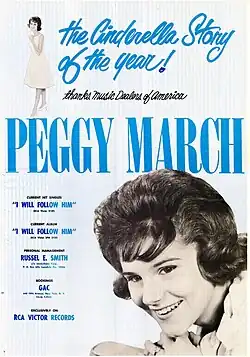 Peggy March (born Margaret Annemarie Battavio, March 8, 1948)[1] is an American pop singer. In the United States, she is primarily known for her 1963 million-selling song "I Will Follow Him".[2] Although she is sometimes remembered as a one-hit wonder, she continued to have success in Europe well into the 1970s.
