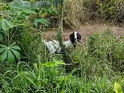 Some owners of pekarangans keep livestock and poultry (traditionally chickens, goats, and sheep), in a household pen. Animals are often allowed to roam around the gardens, village areas, and traditional markets to find food on their own. They are penned at night and are usually given additional feed. Other common domestic animals kept in pekarangans are fishes in ponds and songbirds (e.g. zebra dove, Geopelia striata), which are kept in cages on bamboo poles. The economic status of pekarangan owners plays a role in livestock ownership; lower-class owners tend to own several chickens whereas middle-class owners might have a goat or a sheep, and wealthier owners may own several cows or water buffaloes. Livestock manure acts as an organic fertilizer for the gardens via composting, and sometimes a nutritional source for pond fishes.[14][15]