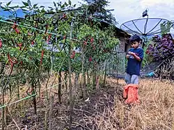 Plants in Javanese and Sundanese pekarangans—especially annual plants grown in the dry season (e.g. eggplants)—are habitually grown near water sources such as fish ponds, open sewage ditches, and wells.[7][11] Plants that need high levels of nutrients, such as banana, mango, jackfruit, and other fruit plants, are planted close to garbage dumps.[11] Meanwhile, crops frequently harvested for cooking, such as chili peppers, lengkuas, lemongrass, and tomatoes, are planted near the kitchen.[11][12]