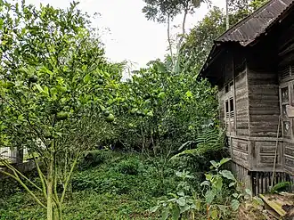 Pekarangans in Lampung culture have their own elements; alongside plants are feet-washing places used before entering into a house's veranda (gakhang hadap[78]), a rice-storage room (walai[79]), an outdoor kitchenette or kitchen, a firewood-storage place, and livestock barn.[80] The front yard is called tengahbah/terambah/beruan, the side yard is kebik/kakebik, and the back yard is kudan/juyu/kebon.[81]
