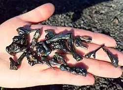 Pele's tears (closest Hawaiian translation: nā waimaka o Pele) are small pieces of solidified lava drops formed when airborne particles of molten material fuse into tearlike drops of volcanic glass. Pele's tears are jet black in color and are often found on one end of a strand of Pele's hair. Pele's tears is primarily a scientific term used by volcanologists.
