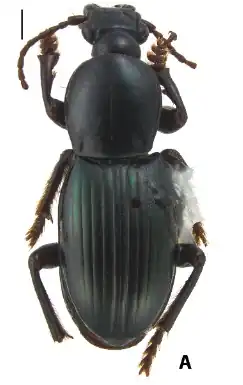 Adults reach a length of about 12 mm. They have an elongate, flat body. The disc of the head, pronotum and elytra are metallic dark green, with purple reflections alongside.