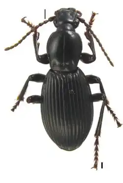 Adults reach a length of about 15 mm. They have an elongate, flat body. The head, pronotum and elytra are shiny black.