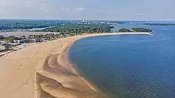 A final design for the beach was unveiled in July 1935.[84][85][86] The beach project involved filling in approximately 110 acres (45 ha) of LeRoy's and Pelham Bays with landfill,[3] followed by a total of 4,000,000 cubic yards (3,100,000 m3) of sand.[87][88] Moses thought that waste from the New York City Department of Sanitation would be cheaper than sand.[87] In early 1935, workers began placing the garbage fill[89] around Rodman's Neck, Twin Island, and Hunter Island.[89][90] After the garbage began washing onto the beach, the rest of the site was filled-in using sand starting in 1936.[87][91] The beach, designed by Gilmore David Clarke and Aymar Embury II, was dedicated in July 1936[74][90] despite only being partially complete.[92][93] The beach officially opened on June 25, 1937.[94] Soon after Orchard Beach opened, it was expanded, starting with the southern locker room in 1939.[95][96] The water between Hunter and Twin Islands was filled in during 1946 and 1947, with new jetties at each end of the beach. The promenade was extended over the fill and opened in 1947,[97][72][68][98] Further improvements were made to the bathhouse pavilion in 1952 and to the northern jetty in 1955. A new concession stand was added north of the pavilion in 1962,[97] and a privately funded Golf driving range was also added that year.[99] The beach was renovated starting in 1964.[100]