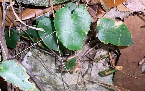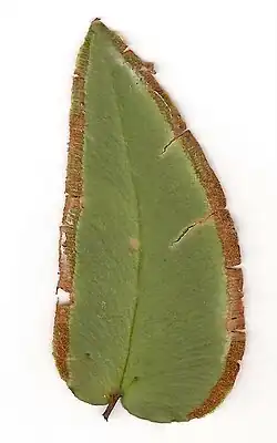 Pellaea paradoxa is a small hardy fern found north of Sydney in eastern Australia and Lord Howe Island.[1] Often growing in or near rainforests in rocky crevices. But it may occasionally be seen in drier areas. Fronds are usually curved, 4 to 9 cm long, and 1 to 4 cm wide. Leathery to touch and a dull green. Juvenile fronds may be heart shaped. The stalks are around 1 to 5 mm long. Sori appear in a band, usually 2 to 3 mm wide, at the edge of the underside of the fronds.[2]