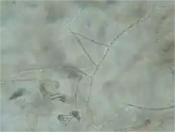 | Microscopic image of Rhizoctonia solani hyphae showing typical right-angled branching | |