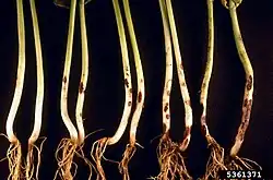 Rhizoctonia solani sensu lato causes a wide range of commercially significant plant diseases. It is one of the fungi responsible for brown patch (a turfgrass disease), damping off (e.g. in soybean seedlings),[10] black scurf of potatoes,[11] bare patch of cereals,[12] root rot of sugar beet,[13] belly rot of cucumber,[14] banded leaf and sheath blight in maize,[15] sheath blight of rice,[16] and many other pathogenic conditions. The fungus, therefore, has a wide host range and strains of R. solani may differ in the hosts they are able to infect, the virulence of infection, selectivity for a given host (which may range from nonpathogenic to highly virulent), the temperature at which infection occurs, the ability to develop in lower soil levels, the ability to form sclerotia, the growth rate, and survival in a certain area. These factors may not always be distinctive in every host that Rhizoctonia attacks or in every strain thereof.[4]