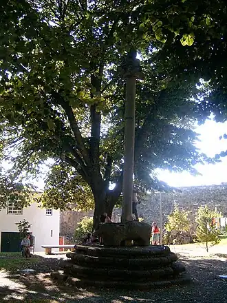 The Pillory of Bragança (Portuguese: Pelourinho de Bragança) is a 15th-century sculpted stone column with symbolic political, administrative and judicial significance, erected over a four-step octagonal platform, located in the civil parish of Sé, Santa Maria e Meixedo, municipality of Bragança. It consists of a cylindrical column erected over a square platform, sculpted with zoomorphic symbols, anthropomorphic scenes and the shield of the city of Bragança. Its structural design and sculptural ornamentation is characteristics of the era; the column is classified as a National Monument since 1910.[1]