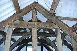 The most important feature of the house is the spere.[12] A spere is a full-height screen in a hall which separates the hall proper from its entrance passage, often, as at Penarth Fawr, taking the form of two short side walls with a wide opening between them.[13] Only about twenty examples of speres exist in Wales, mostly in the north-east, and Penarth Fawr is both the most westerly known example and the only one in Caernarfonshire.[8][5] The spere-posts at the end of the short walls are elaborately moulded and contain Perpendicular Gothic details which continue across the spere truss, the beam which runs across the top of the screen. The truss is connected to the uprights by arch braces, and above it are struts connecting to the principal rafter; the openings are all cusped, that at the apex forming a quatrefoil. The arch-braced collar beam over the central bay of the hall is similarly decorated; beyond it was originally a louvre, supported by a small cusped truss on its northern side.[8][12] The trusses in the northern wall and south of the screen are plain. In the three northern bays the two rows of purlins are supported by cusped wind-braces between the principal rafters. It is possible a moveable screen once stood between the spere-posts.[8][12]