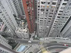 In the 1970s Hong Kong was in a similar position of high land values and lax zoning laws, and started building pencil towers.[8] Multiple factors contributed: in 1964 the Hong Kong Housing Authority finished the Choi Hung Estate for 43,000 residents who suffered from a massive fire in 1953. Those public housing units were 280 square feet (26 m2) to 450 square feet (42 m2) which set a new expectation for the sizes of residential units in private developments. The cost of land leasing for residential developments was also a big factor in the building designs at that time. Hong Kong's government owned all the land and leased some out for private development through auctions for various terms, such as 50, 75, 99 and 999 years. Developers needed to pay tens of thousands of HK$ for leasing each square meter (11 sq ft) of land. Meanwhile, some innovative building designs emerged. The use of scissor staircases, in which two fire escape staircases intertwined, shrank the width of the fire escape void, allowing buildings to be narrower. These factors incentivized developers to build slender residential towers on small lots with one unit per floor. Developers only needed to acquire a lot with a frontage area of two small retail shops (two tong lau buildings) in order to build a tower of 20 stories or more. This was when the term "pencil towers" was used to describe these micro-developments. Currently, a 430-square-foot (40 m2) unit on a pencil tower has an average price of HK$4.3 million.[6][15][16] (US$0.55 million)