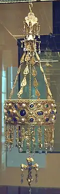 Pendilia (singular pendilium; from Latin pendulus, hanging) or pendoulia (the Greek equivalent), are pendants or dangling ornaments hanging from a piece of metalwork such as a crown, votive crown, crux gemmata, or kamelaukion, and are a feature of Early Medieval goldsmith work. On crosses the pendilia may include the letters alpha and omega, and on votive offerings, which were often designed to be hung over altars and where pendilia are at their largest and most spectacular, they may spell out whole words (see illustration).