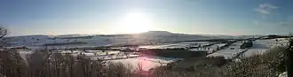 Penhill (526 metres (1,726 ft) high at the trig point, 553 metres (1,814 ft) at Height of Hazely) is a prominent hill, 5.5 miles (9 km) south west of Leyburn, in the Pennines, North Yorkshire, England.[1] It forms a ridge that commands the southern side of Wensleydale and the northern side of Coverdale. Its concave shape was formed during the last ice age, when glaciers carved Wensleydale into a U-shape. The summit plateau has a trig point, small tarns on the peat moor, and, visible from the valley floor, a beacon at its eastern end, part of the large network built to warn of a Spanish invasion.[2]