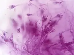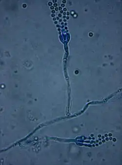 The thallus (mycelium) consists of highly branched networks of multinucleated, usually colourless hyphae, with each pair of cells separated by a septum. Conidiophores are at the end of each branch accompanied by green spherical constricted units called conidia. These propagules play a significant role in reproduction; conidia are the main dispersal strategy of these fungi.[9]