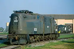 The GG1 was developed in 1930s by General Electric as the replacement for the Pennsylvania Railroad's then standard electric locomotive, the P5a, and was based largely on the New Haven EP3.[2] The GG1 was capable of a top speed of 100 miles per hour (160 km/h), powered by its twelve 385 horsepower (287 kW) traction motors. The prototype GG1, PRR 4800, was tested against Westinghouse's submission, the R1. The Pennsylvania selected the GG1 over the R1, as the R1 was not articulated and the GG1's traction motors were similar to ones already in use.[3] An order for 57 GG1s was placed in November 1934 and the first locomotives were delivered in April 1935.[4]