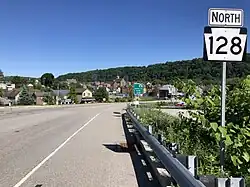 A short distance past this interchange, the route reaches Slate Lick and turns east onto Cadogan Slate Lick Road, passing through more rural areas with some residences. The road crosses into North Buffalo Township and passes under the PA 28 freeway without an interchange. PA 128 continues east before turning south into forested areas and entering Cadogan Township. The route becomes Main Street and heads into the community of Cadogan, passing homes. PA 128 turns northeast onto Prospect Avenue and passes more residences before crossing back into North Buffalo Township and becoming Ford City Road. The road heads through woods before coming into areas of fields and homes. The route turns southeast and comes to the Ford City Veterans Bridge over the Buffalo and Pittsburgh Railroad and the Allegheny River, entering Manor Township. PA 128 curves northeast and heads into the borough of Ford City, becoming 5th Avenue as it passes numerous homes. The road runs through the commercial downtown of Ford City before continuing past more residences and businesses. PA 128 crosses back into Manor Township and comes to its northern terminus at an intersection with PA 66.[2][3]