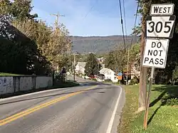 At the top of the mountain, PA 305 crosses into Union Township in Mifflin County and leaves the boundaries of Rothrock State Forest. The route begins to descend the forested mountain, curving to the east.[1][3] At the base of Stone Mountain, the road turns to the southeast and heads into the Kishacoquillas Valley, an agricultural valley which is home to an Amish community.[1][3][4] Here, the route runs through farmland with some residences. PA 305 continues southeast to its eastern terminus at an intersection with PA 655 near the community of Belleville.[1][3]