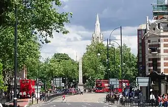 Penny Lane is a road in the south Liverpool suburb of Mossley Hill. The name also applies to the area surrounding its junction with Smithdown Road and Allerton Road, and to the roundabout at Smithdown Place that was the location for a major bus terminus, originally an important tram junction of Liverpool Corporation Tramways.[7] The roundabout was a frequent stopping place for John Lennon, Paul McCartney and George Harrison during their years as schoolchildren and students.[7] Bus journeys via Penny Lane and the area itself subsequently became familiar elements in the early years of the Lennon–McCartney songwriting partnership.[8] In 2009, McCartney reflected: