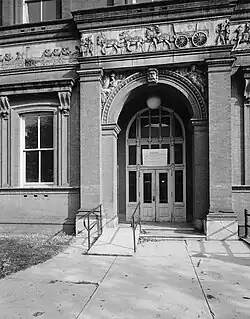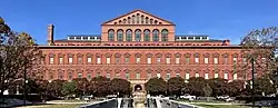The National Building Museum is housed in the former Pension Bureau building, a brick structure completed in 1887 and designed by Montgomery C. Meigs, the U.S. Army quartermaster general.[2] It is notable for several architectural features, including the spectacular interior columns and a frieze, sculpted by Caspar Buberl, stretching around the exterior of the building and depicting Civil War soldiers in scenes somewhat reminiscent of those on Trajan's Column as well as the Horsemen Frieze of the Parthenon. The vast interior, measuring 316 × 116 feet (96 × 35 m),[4] has been used to hold inauguration balls; a Presidential Seal is set into the floor near the south entrance.