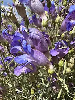 It is a rounded, branching, erect shrub reaching one meter in maximum height. The thick leaves are linear to lance-shaped with rolled, untoothed edges and reaching up to 7 centimetres (2.8 in). The glandular inflorescence produces several wide-mouthed tubular or funnel-shaped flowers measuring 2 to 3 cm (0.8 to 1.2 in) long. The flowers are blue-purple, glandular on the outer surface and mostly hairless inside except for the hairy staminode.