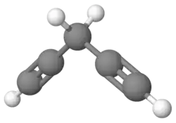 While for 1,4-pentadiene the sp2-hybridization leads to a bond angle of 120° between the single and double bond, in 1,4-pentadiyne it is a 180° angle due to the sp-hybrid orbital. Both triple bonds in 1,4-position destabilize each other according to another study by 3.9 kcal · mol−1, a repulsion between the p orbital lobes close to the sp3-hybridized carbon has been postulated.[11] According to a QCSID(T) calculation, the alkiyne is destabilized relative to 1,3-pentadiyne by 25 kcal · mol−1.[12]